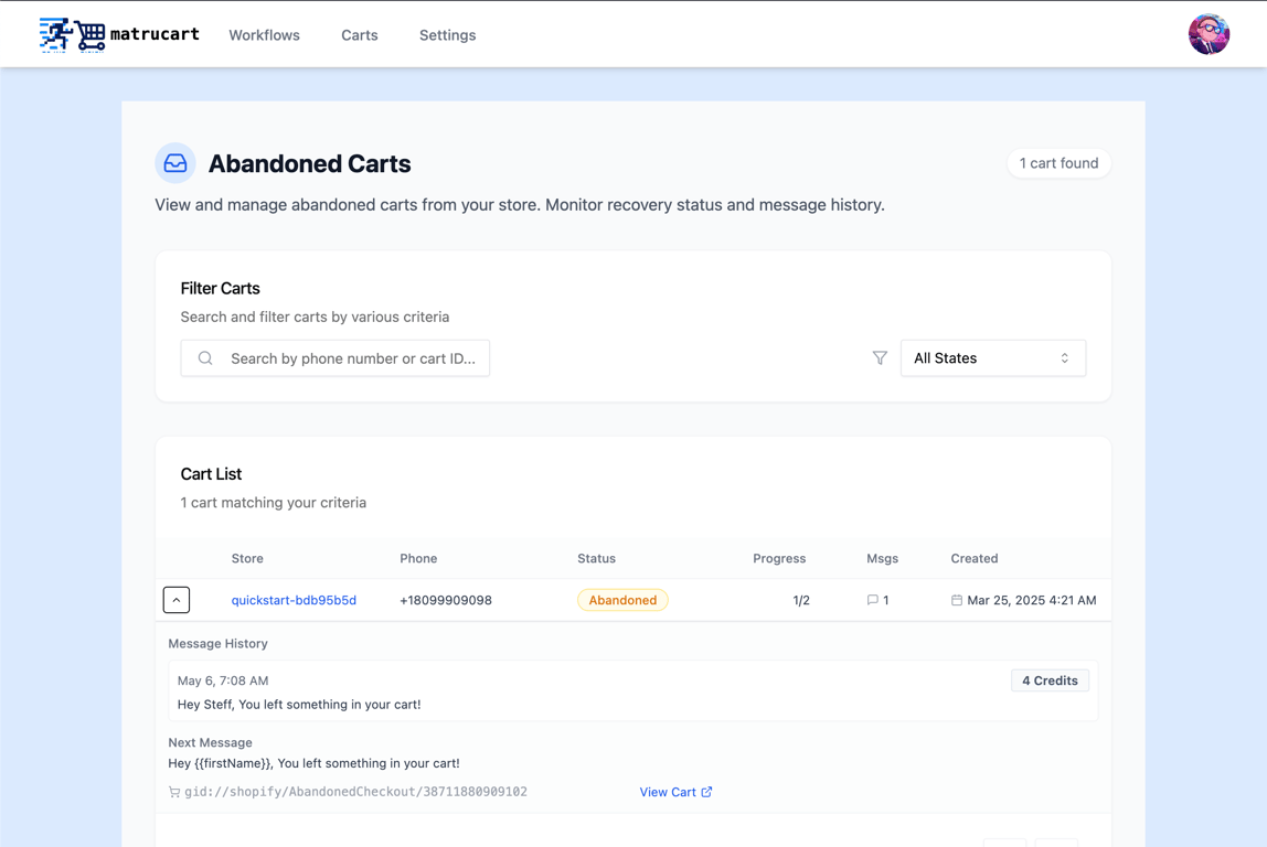 Matrucart will automatically start sending these messages after the elapsed time! By navigating to the Carts section, you can view the status of each abandoned cart including details on weather the message has been sent, how many and of course, if the cart converted.