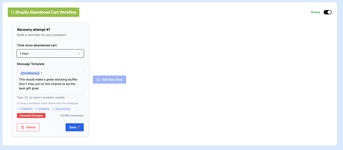 A workflow can have multiple steps where each step specifies how which message to send after how long. In the screenshot below, after 1 hour, the following message will be sent to the shopper. You can add up to 5 steps per workflow.